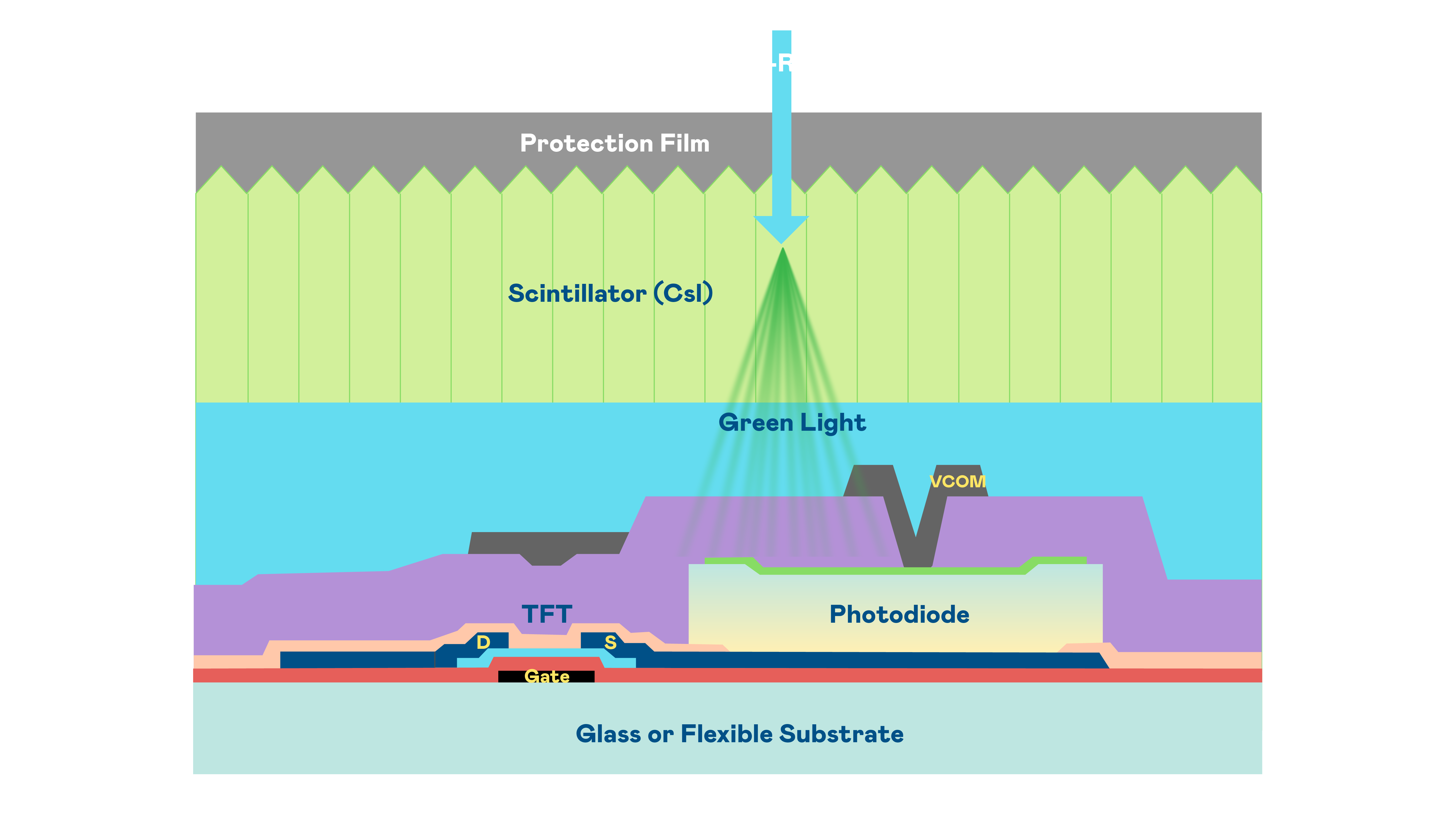 z6尊龙的X光影像感測陣列使用薄膜電晶體 (TFT) 作為每個像素的讀取開關,搭配光電二極體(Photodiode)的光電轉換元件,用以感測X光影像訊號。